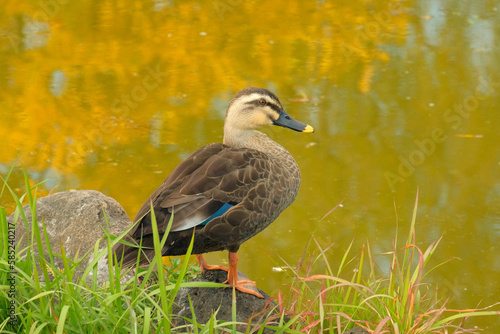 Fototapeta premium 湖畔で休むカルガモ