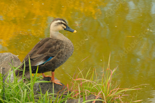 Fototapeta premium 湖畔で休むカルガモ