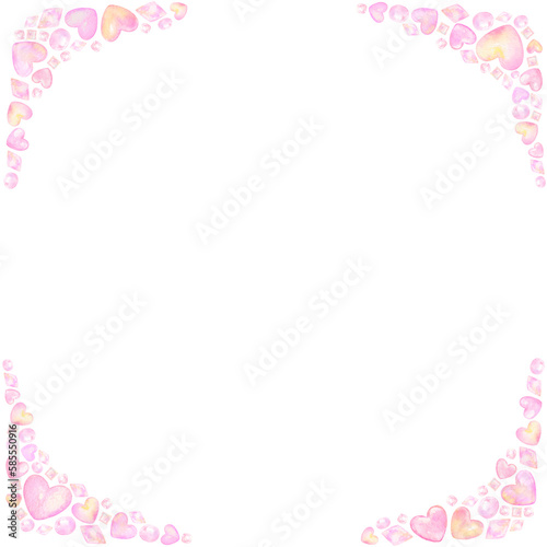 Obraz premium ピンク色のハートと宝石で形作ったキラキラフレーム。水彩絵の具で描いたイラスト。