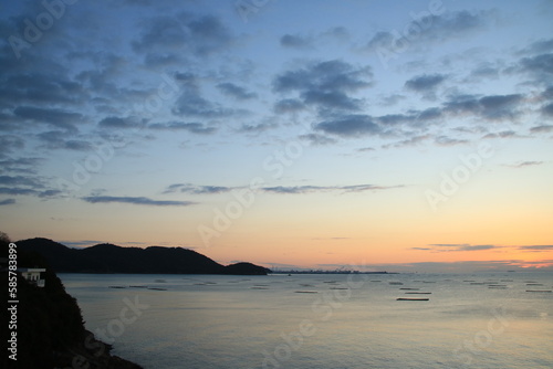 Fototapeta premium 兵庫県たつの市御津町室津から見た牡蠣筏並ぶ播磨灘の夜明け前の風景