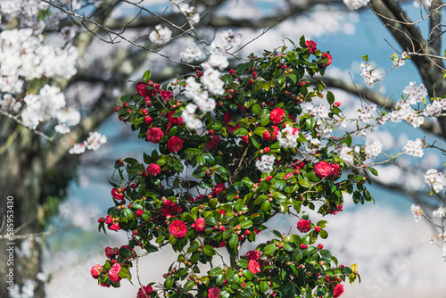 © cat_smile, Obraz premium 桜の花背景の山茶花