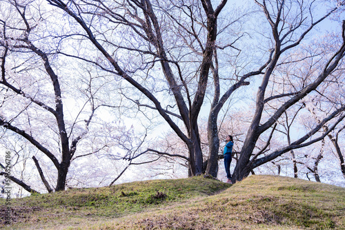 © NAMBA, Obraz premium 大きな桜の木の下にいる女性