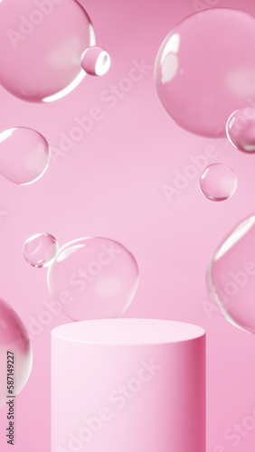 Fototapeta premium ピンクの背景に浮かぶたくさんの水滴。台座の背景素材。(縦長)