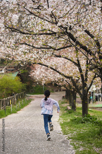 © zheng qiang, Fototapeta premium 満開の桜と元気で走って遊んでいる子供の様子