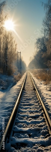 Fototapeta premium 눈 덮힌 기찻길 겨울 풍경. 인공지능 생성