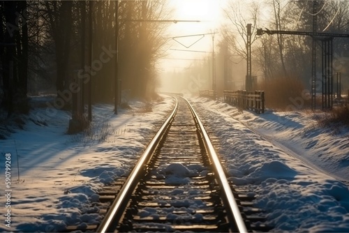 Fototapeta premium 눈 덮힌 기찻길 겨울 풍경. 인공지능 생성