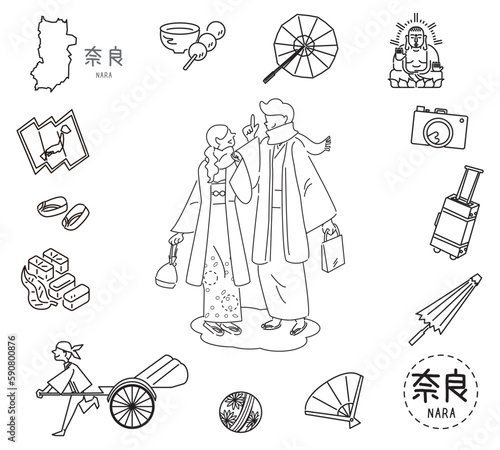 © ribitts, Obraz premium 日本の奈良の名物観光のアイコンと着物のカップルのセット(線画白黒)
