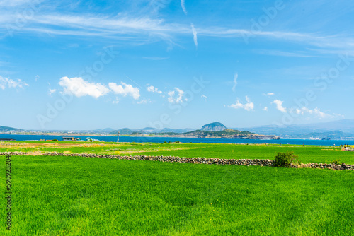 Obraz premium 제주 산방산이 보이는 가파도 청보리밭