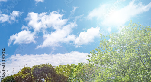 Obraz premium 春、新緑の森の木々の上の晴天の青空 旅行・観光・祝日・アウトドア・子供の日のイメージ