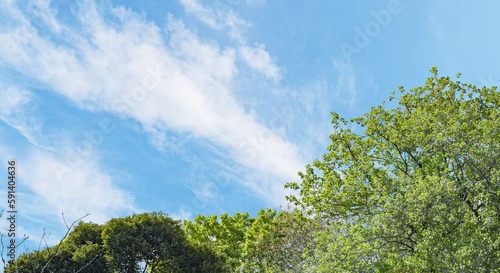 Obraz premium 春、新緑の森の木々の上の晴天の青空 旅行・観光・祝日・アウトドア・子供の日のイメージ