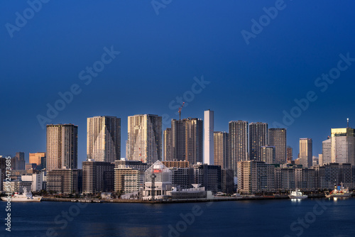 Obraz premium 夕暮れ時の東京湾レインボーブリッジから見る晴海ふ頭とタワマン群