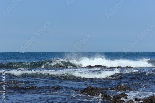© Zorba, Fototapeta premium 잔잔한 바다에서 밀려와 바위에서 부서지는 거친 파도물결