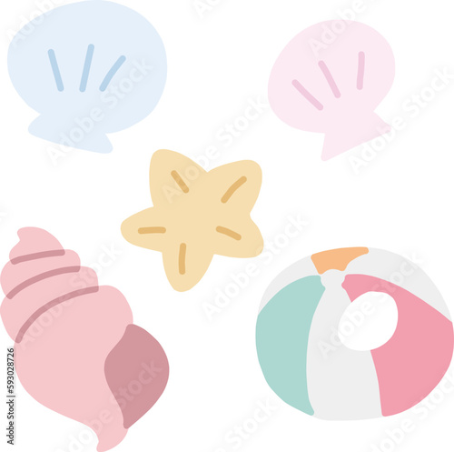Obraz premium 貝やヒトデやビーチボールの海辺の小物素材セット