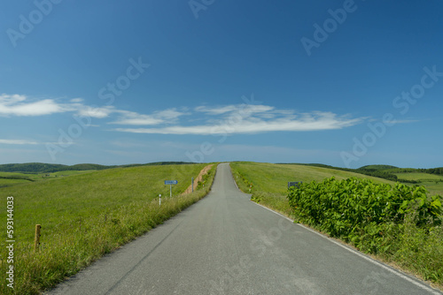 Fototapeta premium 北海道の草原地帯を走る直線道路