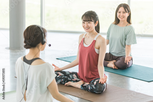 Obraz premium マイクをつけたヨガ講師とヨガ教室・ピラティスでヨガを習う女性達