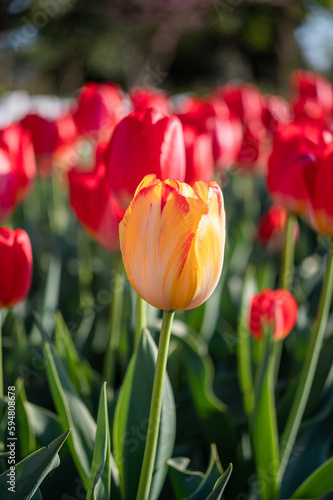 Obraz premium 赤いチューリップに1輪混ざる黄色のチューリップ
