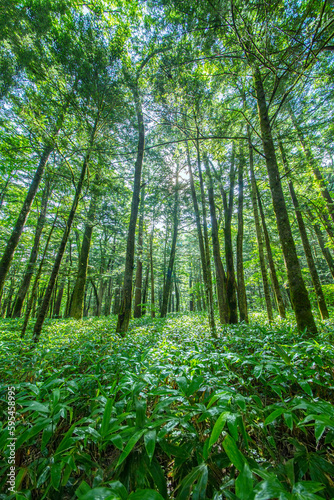 Obraz premium ローアングルで撮影した、太陽光の差し込む新緑の森林