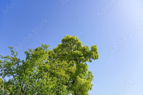 Obraz premium 青空バックに見上げる新緑のクスノキの若葉
