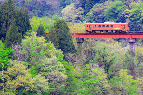 © arpeggio1886, Fototapeta premium 第2九頭竜川橋梁を渡る越美北線のオレンジ色の単行気動車