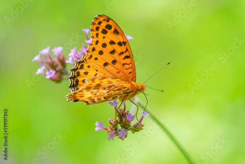 Obraz premium 柳花笠の花にとまるツマグロヒョウモン