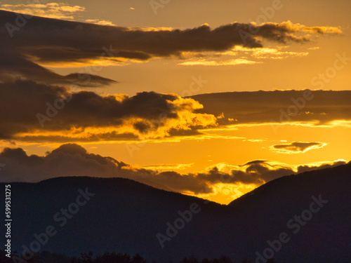 © Kazuhiro.Kimura, Fototapeta premium 夕焼け, 空, 山, 太陽, 日の出, 雲, 自然, 風景, オレンジ, 山, 雲, 今夜, 夜会, 光, 太陽光, シルエット, 赤, 景色, ヒル, 旅行, 夜明け, モーニング, ヒル, 黄色, 色