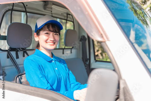 Obraz premium トラックに乗って運転をする業者の女性(引越し・配達・ドライバー・宅配・配達員・宅急便)