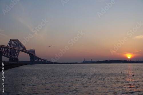 © Giusto, Obraz premium 夕暮れに橋の上を飛ぶ飛行機
