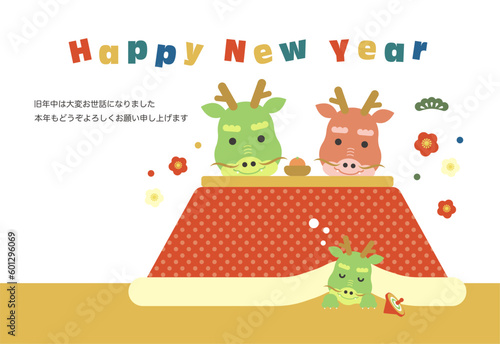 © neg, Naklejka premium 辰年の年賀状テンプレート ベクター 干支 家族 親子 こたつ