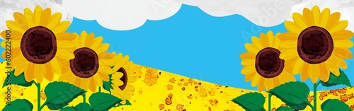 Obraz premium バナー フレーム ひまわり 夏 空 花 植物 水彩 背景 イラスト素材