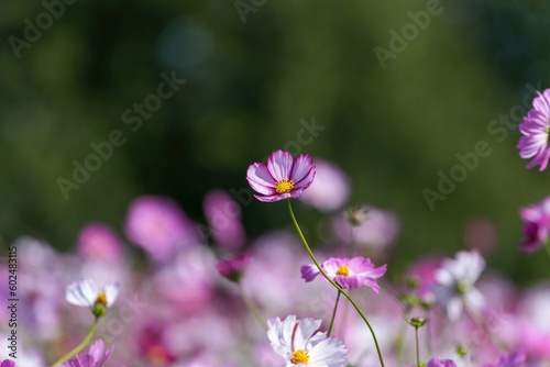 Fototapeta premium グリーンバックに咲く満開のピンクのグラデーションのコスモス