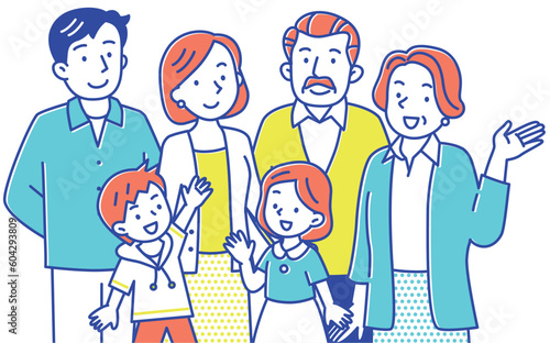 Naklejka premium 笑顔でこちらを向いた三世代の仲良し6人家族