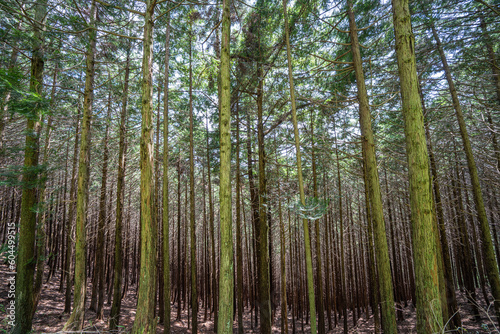 © KOMAKI JUN, Fototapeta premium 天空の茶畑展望台に行く途中の針葉樹林帯