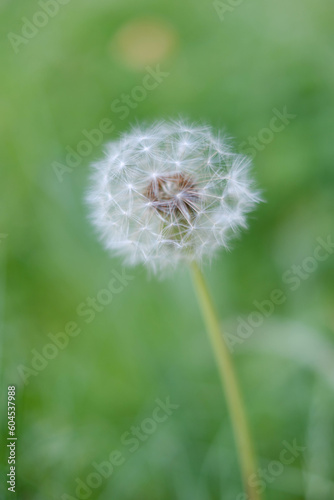 Obraz premium 野原の緑の草の中で風に揺れるタンポポ