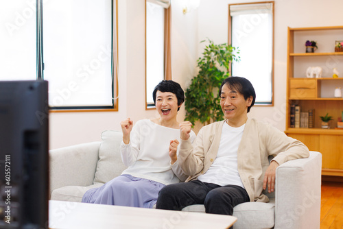 Fototapeta premium 家でテレビを見ている成熟した日本のカップル