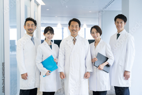 Fototapeta premium 年齢層の幅が広い使いやすい笑顔の複数のドクターや研究者のイメージの全員集合写真 カメラ目線