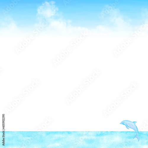 Obraz premium 青空と海とイルカの爽やかな夏向けフレーム。水彩イラスト。