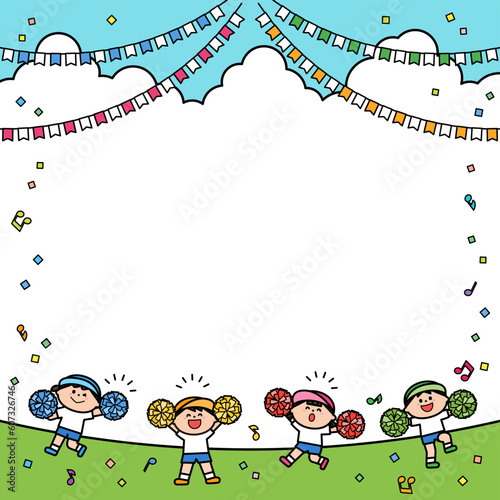 Obraz premium イラストフレーム 運動会 ポンポンを持って踊る子どもたち.