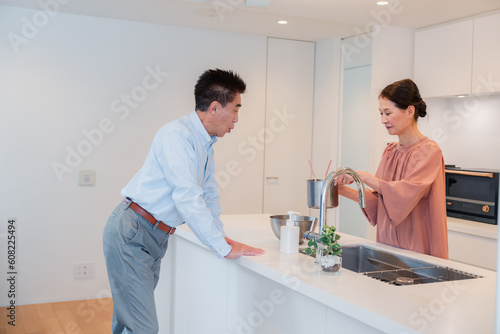 Fototapeta premium キッチンで一緒にクッキングを楽しむシニアの夫婦