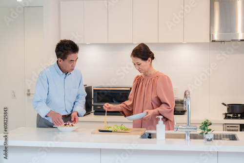 Fototapeta premium キッチンで一緒にクッキングを楽しむシニアの夫婦