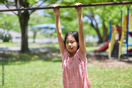 © zheng qiang, Fototapeta premium 夏の公園で鉄棒を遊んでいる小学生の女の子の様子