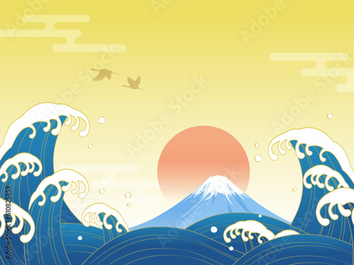 Fototapeta premium 波と富士山と日の出の和風背景_ベクターイラスト