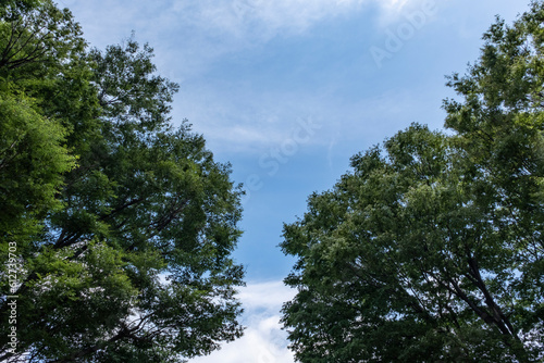 © tenpadasi, Obraz premium 夏、梅雨明け、さわやかな晴天の青空と折り重なったふわふわの積乱雲、新緑の森林、山の木々の背景 夏休み・天気・アウトドア・旅行・バカンスのイメージ