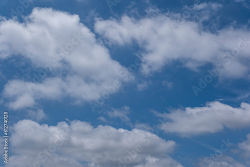 Fototapeta premium 夏、梅雨明け、さわやかな晴天の青空と折り重なったふわふわの積乱雲の背景 夏休み・天気・アウトドア・旅行・バカンスのイメージ