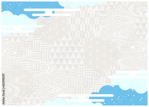 © nana10n no AI, Obraz premium 白地に青の雲と六角和柄背景ヨコ