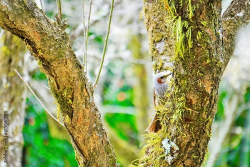 Obraz premium ノキシノブの生えた梅の木の幹に止まって突く小鳥、ヒヨドリ