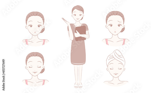 Fototapeta premium カルテを持つエステティシャンのイラストとフェイシャルエステの女性のベクター手書き風人物素材_エステサロン・クリニック