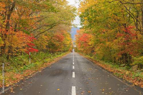 © walkingcow3039, Obraz premium 秋の紅葉した並木と道「秋の北海道・屈斜路摩周湖畔線」