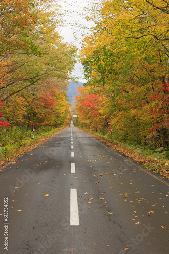 © walkingcow3039, Obraz premium 秋の紅葉した並木と道「秋の北海道・屈斜路摩周湖畔線」
