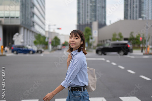 Fototapeta premium ビジネス街の横断歩道を渡る笑顔のビジネスウーマン