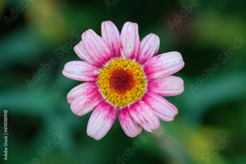 Obraz premium 散歩道の花壇で見つけたキク科の可愛い花。ピンクと黄色が印象的。